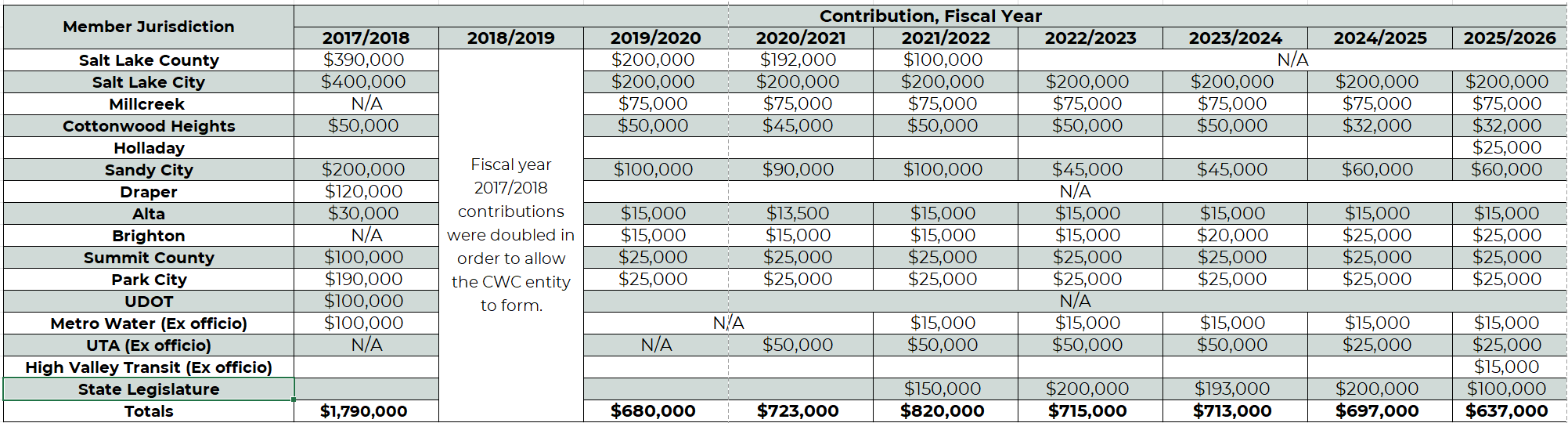 The following matrix illustrates member jurisdiction monetary contributions to the Central Wasatch Commission entity starting in fiscal year 2017/2018 through fiscal year 2021/2022.