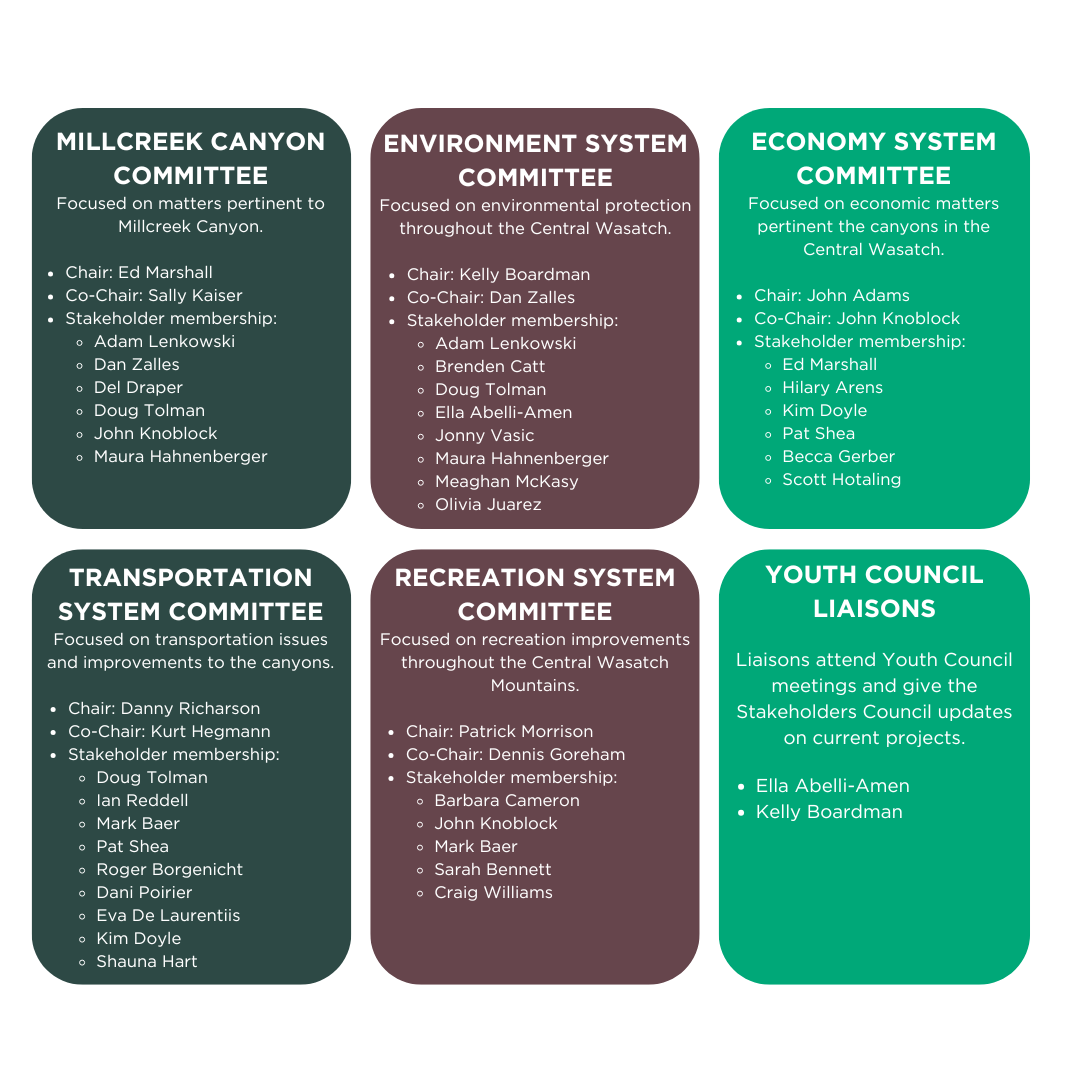 Inspired by the Mountain Accord system groups, the Stakeholders Council committees mirrors that framework of balancing transportation, recreation, environmental, and economic interests. Due to the unique nature of Millcreek Canyon compared to other canyons in the Central Wasatch, there is also one committee dedicated to Millcreek Canyon.